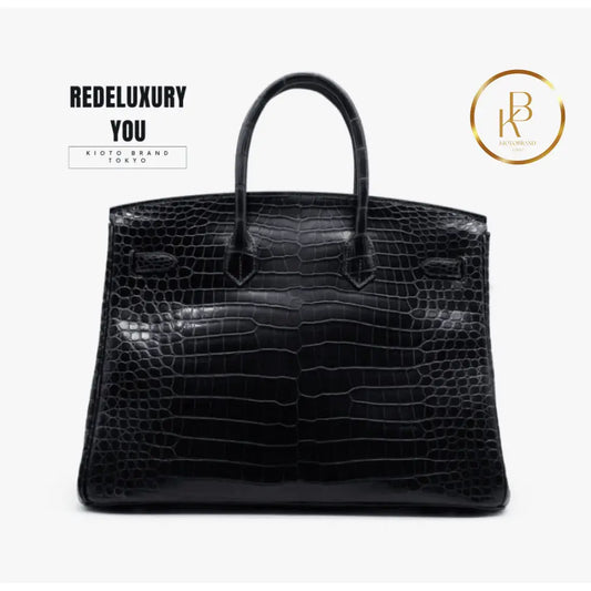 Birkin 35 Black Shiny Porosus Croc 18K White Gold Diamond hardware